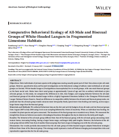 2025年2月15日,相关研究结果以“Comparative Behavioral Ecology of All-Male and Bisexual Groups of White-Headed Langurs in Fragmented Limestone Habitats”在《American Journal of Biological Anthropology》(中科院二区)发表。论文第一单位为广西师范大学珍稀濒危动植物生态与环境保护教育部重点实验室,我院刘若爽博士和2022级生态学研究生黄然为论文共同第一作者,周岐海教授和范鹏来教授为共同通讯作者。该研究获得了国家自然科学基金项目 (32170492,32270504),广西自然科学基金项目(2019GXNSFDA245021,2022GXNSFDA080004),广西科技项目(Guike23026190) 的资助。